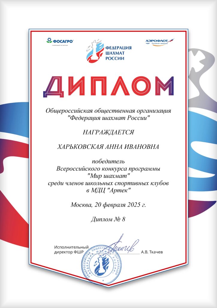 Воспитанница Зимовниковской детско-юношеской спортивной школы Анна Харьковская стала одним из победителей конкурса «Мир шахмат» и выиграла путёвку в «Артек».