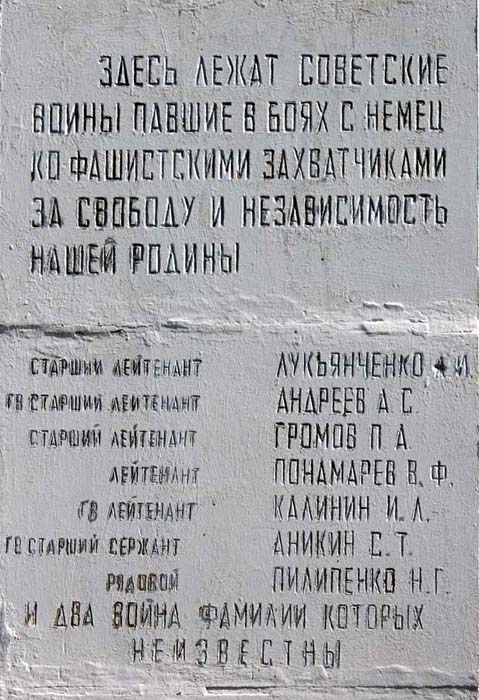 В 1974 году на месте пирамидки был установлен памятник — скульптура солдата со склонённой головой, в знак скорби о погибших воинах. Здесь захоронено 9 красноармейцев, погибших в 1942 году при защите от нацистов хутора Камышев, вот их имена: старший лейтенант Лукьянченко А.И., гвардии старший лейтенант Андреев А.С., старший лейтенант Громов П.А., лейтенант Понамарёв В.Ф., гвардии лейтенант Калинин И.Л., гв. старший сержант Аникин С.Т., рядовой Пилипенко Н.Г., и ещё два воина-красноармейца, фамилии которых неизвестны.