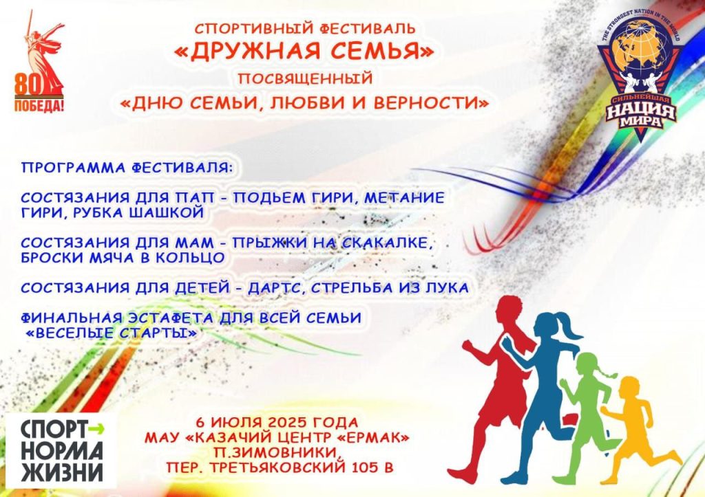 6 июля в МАУ «Казачий центр «Ермак» (п. Зимовники, пер. Третьяковский, 105 В) состоится спортивный фестиваль «Дружная семья», посвященный Дню семьи, любви и верности.