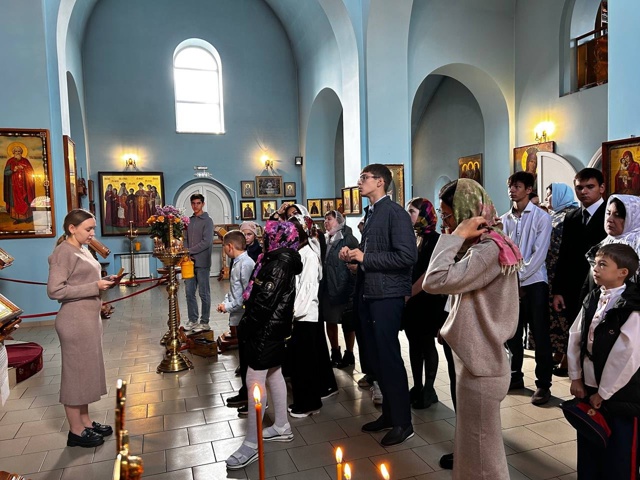 В рамках Покровского конкурса чтецов русской духовной поэзии «Сыны Отечества» в храме апостолов Петра и Павла посёлка Зимовники для гостей и участников конкурса волонтёры молодёжно-патриотического объединения «СЛАВА» Зимовниковского педагогического колледжа провели экскурсию по храму на тему «Сыны Отечества: Защитники Веры и Земли Русской».