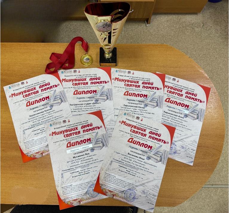 Театральная студия «Дебют» представила на суд жюри литературный спектакль «А в детской памяти мгновения войны». Коллектив был награждён дипломом Лауреата I степени и памятным кубком.